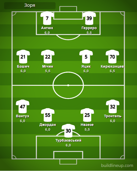 «Зоря»: Турбаєвський – Вантух (Жуніньйо, 46), Джордан, Нваезе (Вакула, 63), Тронтель – Башич, Мічин (Дришлюк, 46), Яцик, Кирюханцев (Кораблін, 63) – Антюх, Герреро (Горбач, 78).