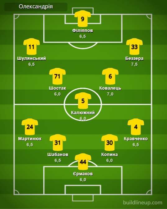 «Олександрія»: Єрмаков – Мартинюк, Шабанов, Копина, Кравченко (Кампуш, 71) – Шостак (Мишньов, 66), Калюжний, Ковалець (Смирний, 46) – Шулянський (Костишин, 71), Філіппов (Погорілий, 84), Безерра.
