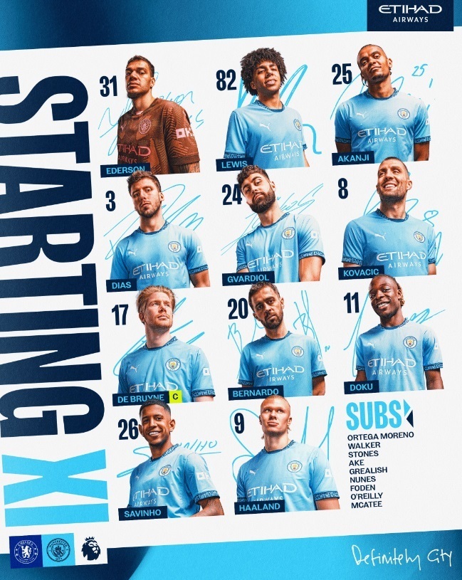 «Манчестер Сіті»: Едерсон, Гвардіол, Діаш, Аканджі, Льюїс, Ковачич, Де Брюйне, Бернарду Сілва, Доку, Савіньо, Холанд