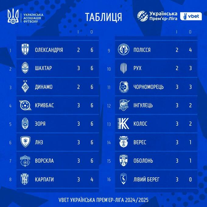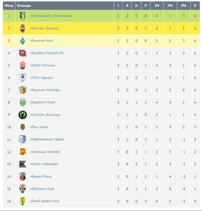 До топ-3 входять команди: Олександрія, Шахтар та Динамо. Далі йдуть: Кривбас, Зоря, ЛНЗ та Ворскла (усі – по 6 очок). При цьому Олександрія та Динамо поки що не втрачали очок у чемпіонаті, а решта 5 клубів мають по 2 перемоги та 1 поразці.