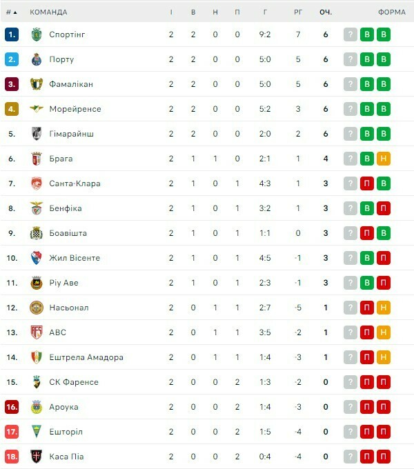 Після двох турів лідирують Спортінг, Порту, Фамалікау, Морейренсе, Віторія Гімараєш (по 6 очок з 6).