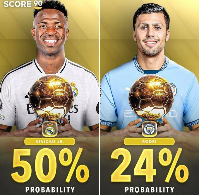 Найбільше шансів виграти Золотий м'яч у бразильського вінгера «Реала» Вінісіуса Жуніора – 40%. Друге місце у найкращого гравця Євро-2024 іспанця Родрі з «Манчестер Сіті» – 24%.