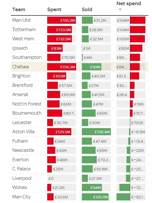 Повідомляється, що Сині цього літа витратили 156,3 млн фунтів. Це більше, ніж у Манчестер Юнайтед (155,2 млн), Тоттенхема та Вест Хема (по 133 млн).
