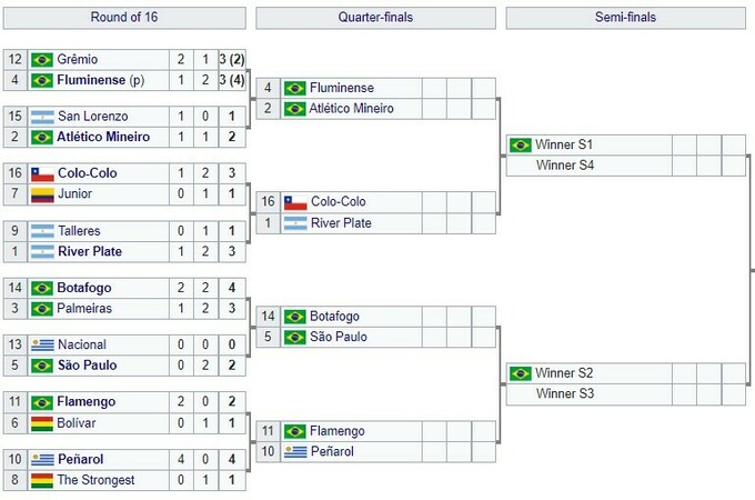 За вихід у півфінали гратимуть: Флуміненсе (Бразилія) – Атлетіко Мінейро (Бразилія), Коло-Коло (Чилі) – Рівер Плейт (Аргентина).