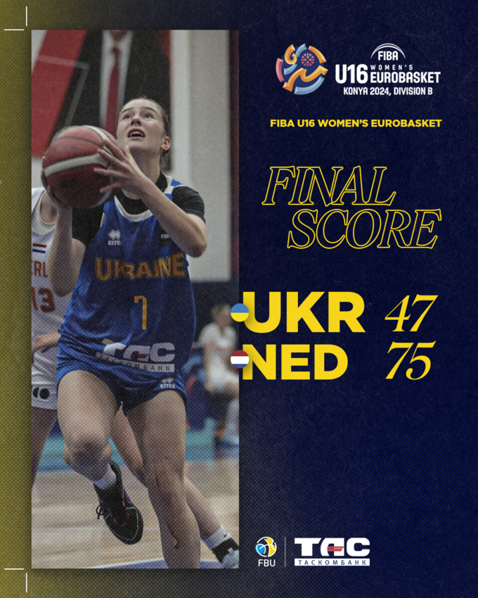 Жіноча збірна України U-16 зазнала поразки в матчі зі збірною Нідерландів з рахунком 47:75 в першому матчі другого етапу за 9–16 місця чемпіонату Європи в Дивізіоні В, який проходить у Коньї, Туреччина.