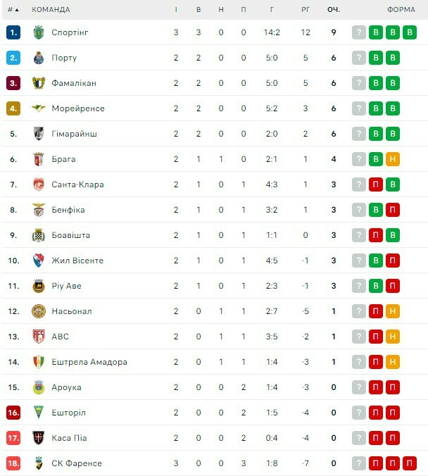 Спортінг лідирує у чемпіонаті Португалії, набравши 9 очок після 3 матчів.