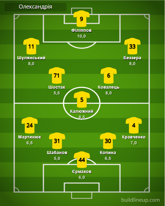 «Олександрія»: Єрмаков – Мартинюк, Шабанов, Копина (Скорко, 81), Кравченко (Кампуш, 68) – Шостак (Ващенко, 46), Калюжний, Ковалець (Мишньов, 60) – Шулянський, Філіппов, Безерра.