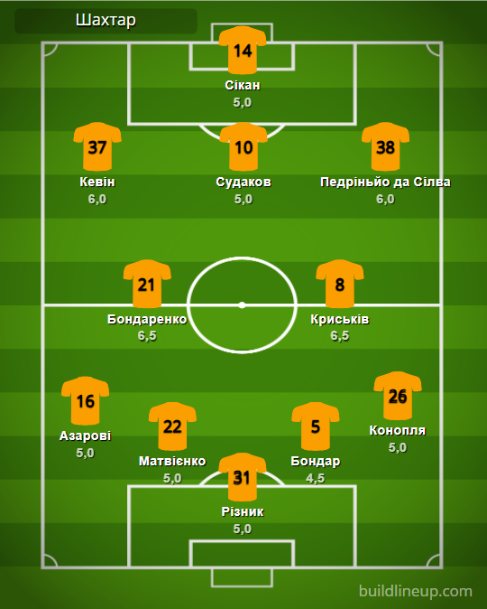 «Шахтар»: Різник – Азаров (Егіналду, 64), Матвієнко (Франьїч, 64), Бондар, Конопля (Вінісіус, 78) – Бондаренко (Невертон, 63), Криськів – Кевін, Судаков, Педріньйо да Сілва – Сікан (Траоре, 63).
