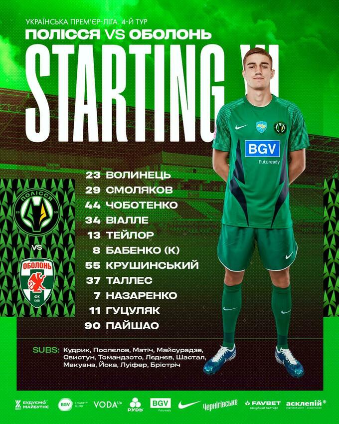 «Полісся»: Волинець – Смоляков, Чоботенко, Віалле, Тейлор (Майсурадзе, 46) – Крушинський (Лєднєв, 46), Бабенко, Таллес Коста – Назаренко (Макуана, 59), Пайшао (Йока, 82), Гуцуляк (Шастал, 72).