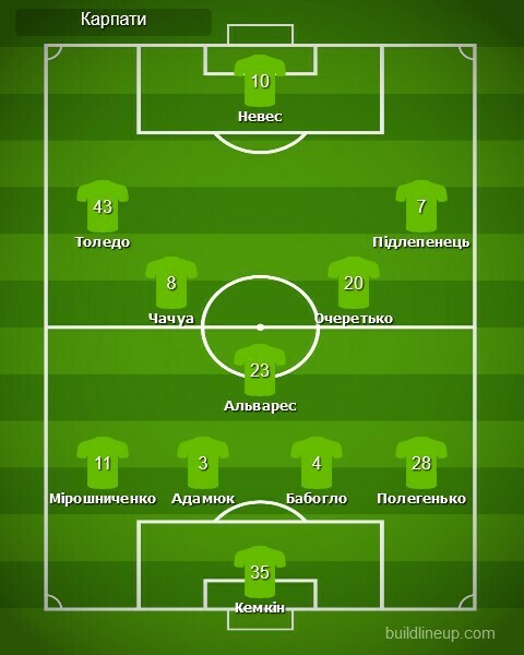 «Карпати»: Кемкін, Мірошніченко, Адамюк, Бабогло, Полегенько, Альварес, Чачуа (Кузик, 73), Очеретько (Устименко, 65), Занетті (Клименко, 56), Підлепенець (Костенко, 73), Невес (Шах, 65).