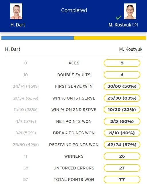 Марта Костюк (Україна) – Геррієт Дарт (Велика Британія) – 7:6(10), 6:1