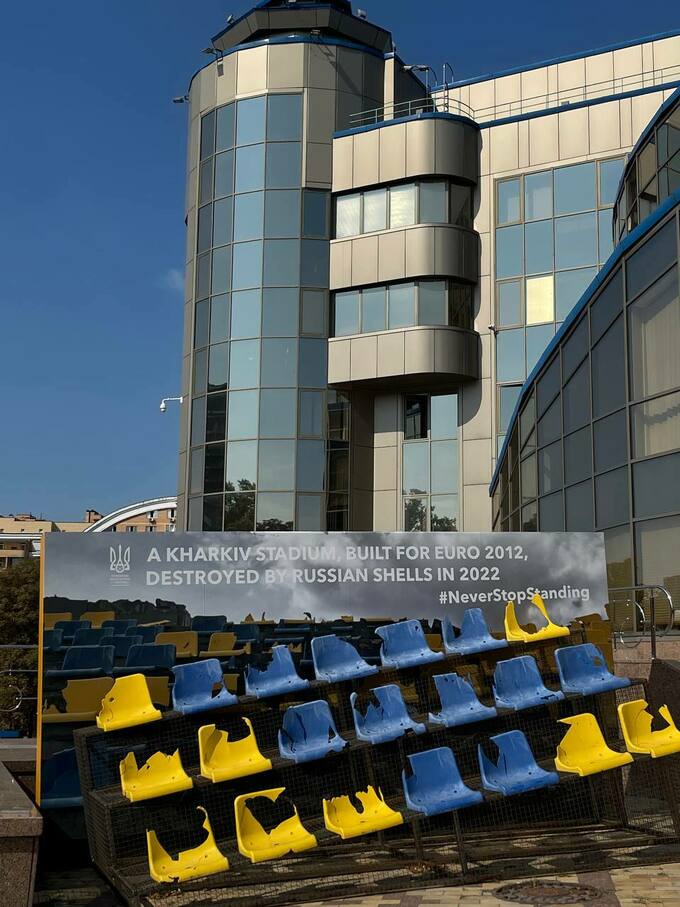 Сьогодні цей символ української незламності стоїть біля Будинку футболу. Він нагадує, що наша боротьба триває. Це лише один із понад 500 спортивних об'єктів, знищених або пошкоджених через бомбардування та ракетні удари росії.