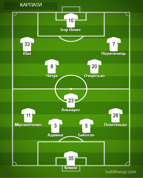 Карпати: Кемкін – Полегенько, Бабогло, Адамюк, Мірошніченко, Альварес, Очеретько, Чачуа (Тлумак, 90+3), Підлепенець (Кузик, 80), Шах (Стеніо, 64), Ігор Невес (Костенко, 64).