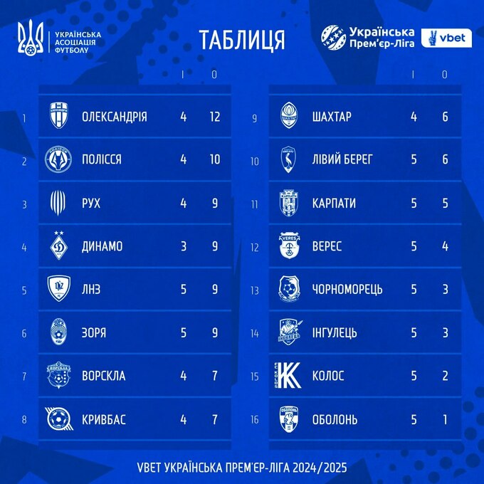 Угорі турнірної таблиці продовжує перебувати Олександрія. Команда Руслана Ротаня набрала 12 балів із 12 і поки що не втрачала очки у чемпіонаті. Далі йде житомирське Полісся (10 пунктів із 12).