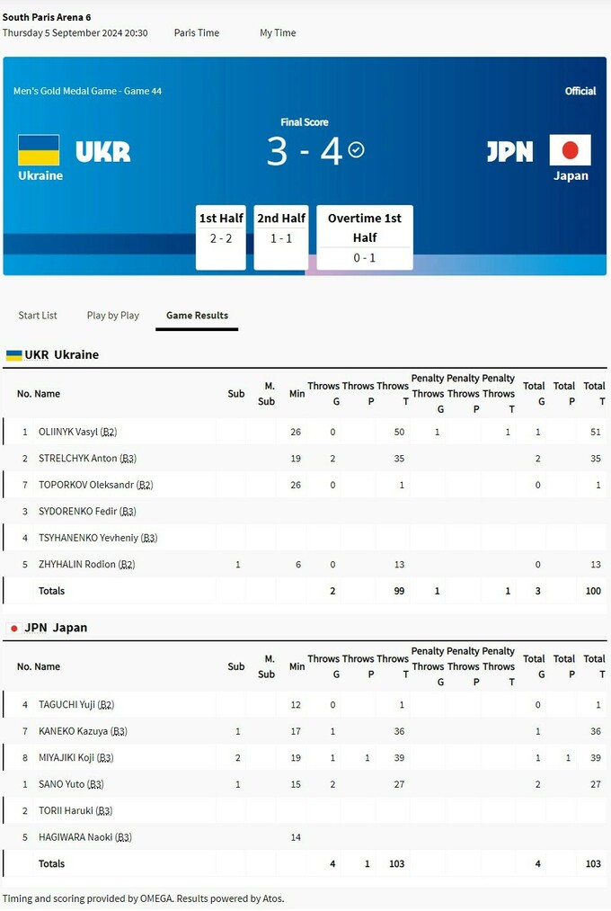 Синьо-жовта команда зазнала поразки від Японії (2:3) у фіналі Паралімпіди-2024 у Парижі, який відбувся 5 вересня.