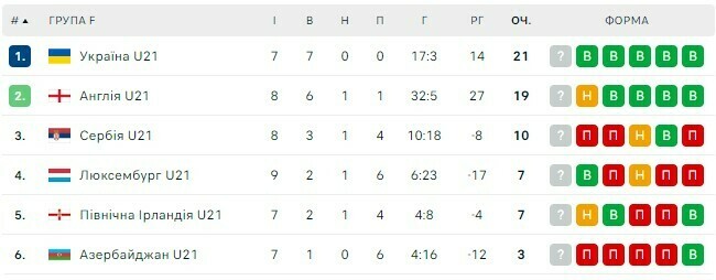 Українська молодіжка лідирує у групі з 21 очком із 21, випереджаючи Англію (19 із 24). Сербія йде на 3-му місці (10 із 24).