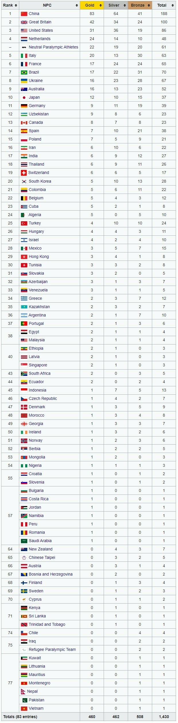83 країни вибороли хоча б одну нагороду, 63 команди мають в активі щонайменше одну золоту медаль.