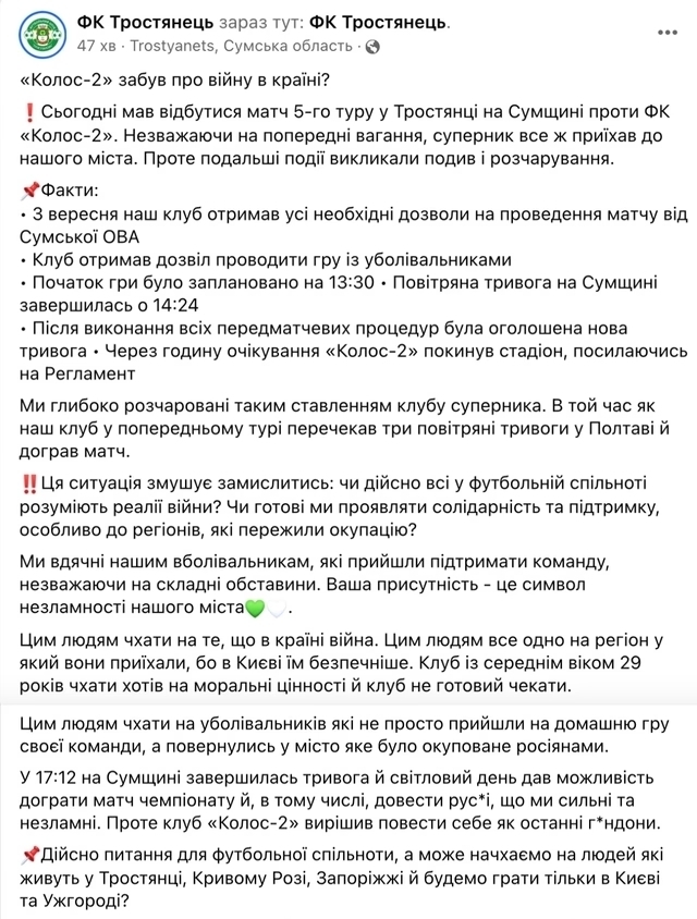«Сьогодні мав відбутися матч 5-го туру у Тростянці на Сумщині проти ФК «Колос-2». Незважаючи на попередні вагання, суперник все ж приїхав до нашого міста. Проте подальші події викликали подив і розчарування.