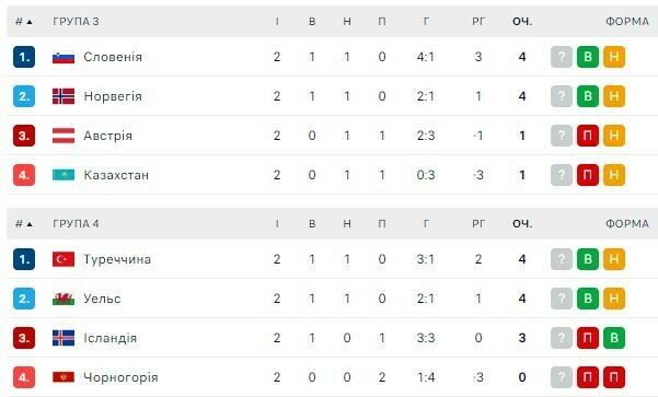 У групі B3 лідирують Словенія та Норвегія (по 4 очки), а у групі B4 попереду Туреччина та Уельс (по 4 бали).
