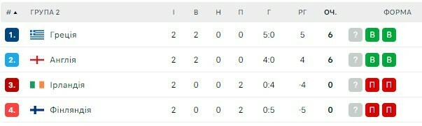 У групі лідирують Греція та Англія (по 6 очок із 6), а Ірландія та Фінляндія йдуть без набраних балів (по 0).
