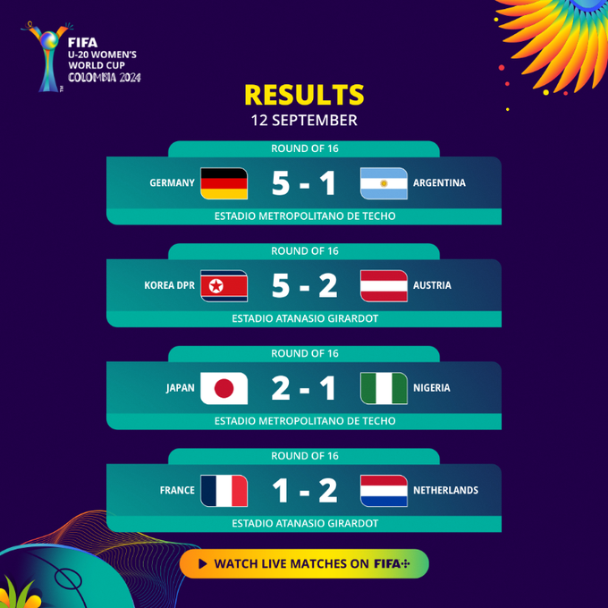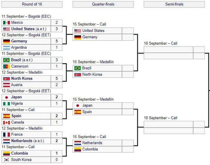 У 1/4 фіналу 15 вересня зіграють: США – Німеччина, Бразилія – Північна Корея, Японія – Іспанія, Нідерланди – Колумбія.