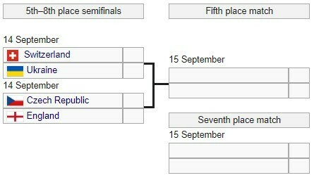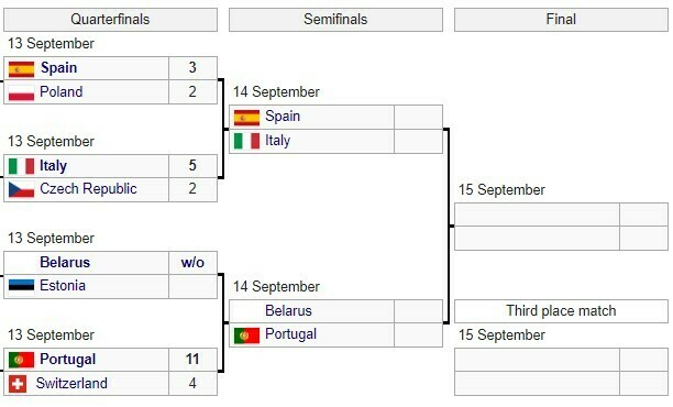 У чоловічому турнірі сформовано пари 1/4 фіналу (14 вересня): Іспанія – Польща, Італія – Чехія, білорусь – Естонія, Португалія – Швейцарія.