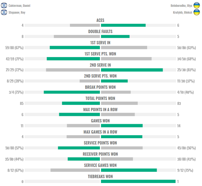 У першій партії українці програвали 1:4 із двома брейками. Крім того, Цукерман та Степанов подавали на сет за 5:4 і мали сетбол, але Олексій та Ілля зуміли оформити камбек. У другій партії Крутих та Білобородько також поступалися 3:5, але на тай-брейку вирвали перемогу та закрили матч.