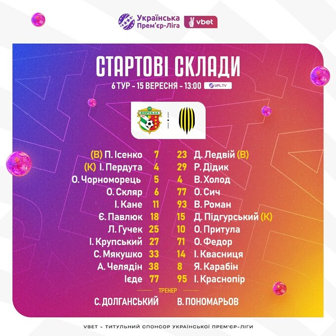 «Ворскла»: Ісенко – Пердута, Чорноморець, Гучек, Крупський – Челядін (Кулаковський, 75), Скляр, Павлюк (Хрипчук, 43) – Мякушко (Нестеренко, 75), Ієде (Ндукве, 90+1), Кане.