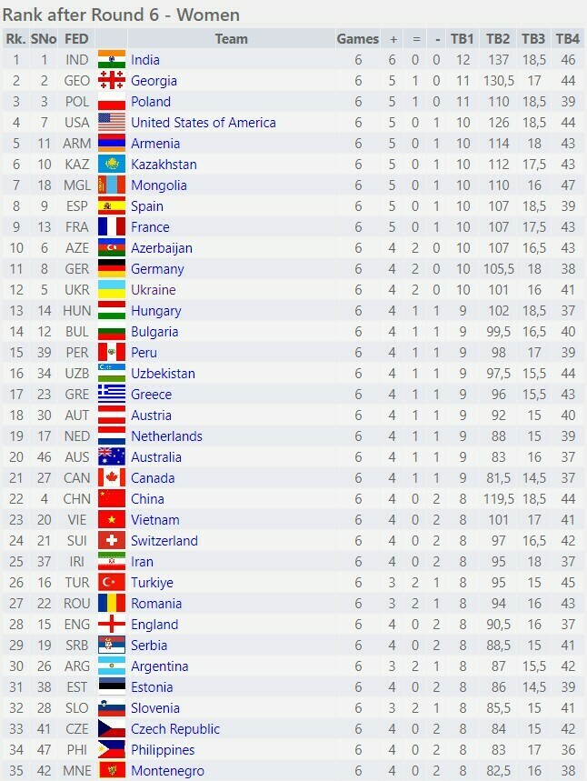 Жіноча українська команда набрала 10 очок із 12 та посідає 12-те місце. Лідирує команда Індії, яка грає без втрат (як і у чоловіків) – 12 із 12. За нею йдуть Грузія та Польща (по 11).