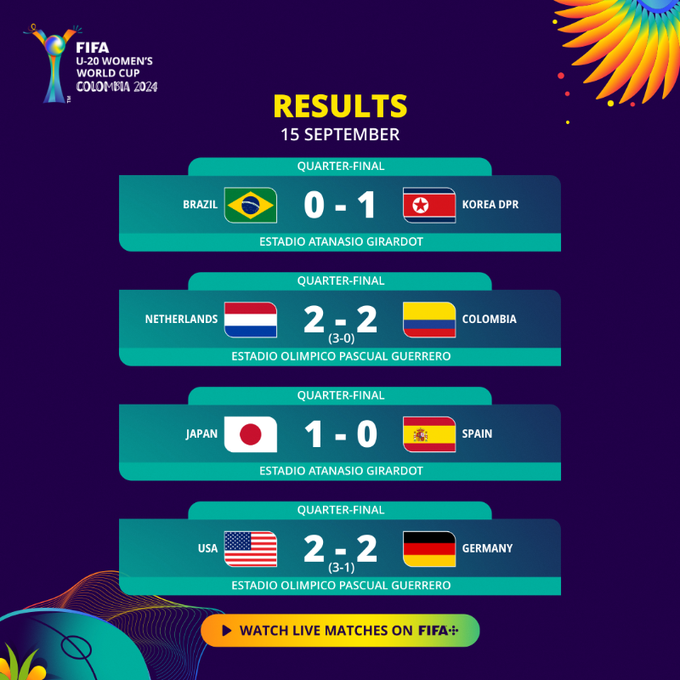 У 1/2 фіналу 18 вересня зіграють: США – Північна Корея, Японія – Нідерланди.