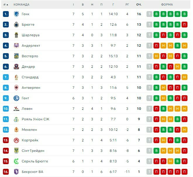 Генк став лідером (16 очок), далі йдуть Брюгге (13), Шарлеруа та Андерлехт (по 12).