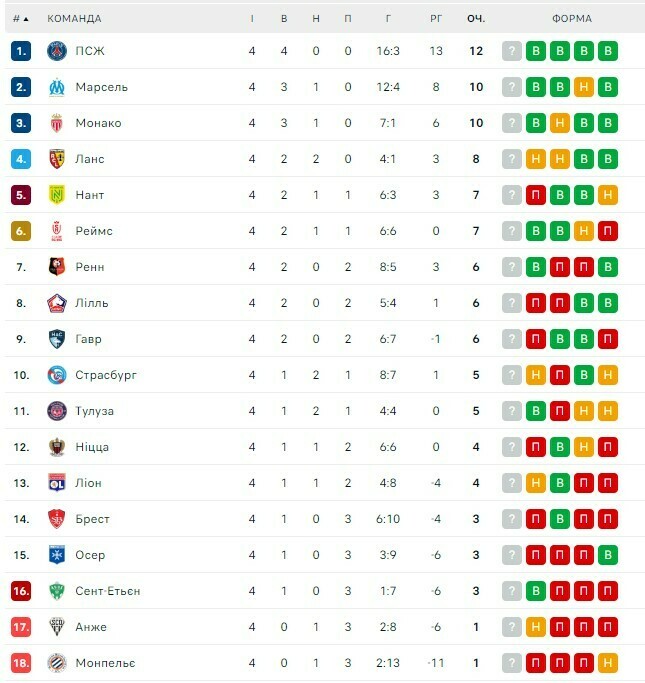 Таблиця Ліги 1. Завершено 4-й тур у Франції. Соболь залишився у резерві