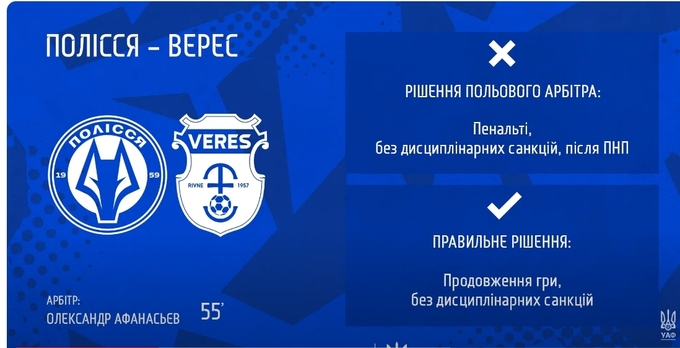 В УАФ ухвалили, що замість перегляду VAR та призначення пенальті потрібно було дозволити продовжувати гру після того, як м'яч зачепив руку гравця Вереса.