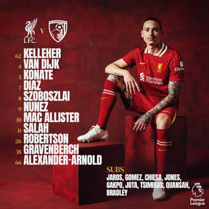 «Ліверпуль»: Келлехер, Робертсон, Ван Дейк, Конате, Александер-Арнольд, Гравенберх, Собослай, Макаллістер, Діас, Салах, Нуньєс