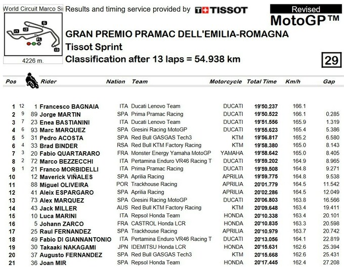 Чинний чемпіон світу Франческо Баньяйя здобув перемогу в спринті Гран-прі Емілії-Романьї MotoGP, який проходить на трасі імені Марко Сімончеллі в італійському Мізано-Адріатико.