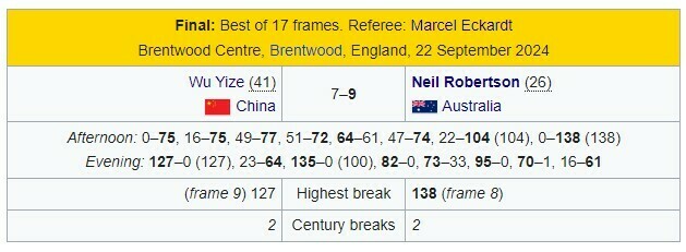 Австралійський снукерист Ніл Робертсон витримав опір зі сторони китайця У Іцзе і здобув перемогу в фіналі турніру English Open з рахунком 9:7, завоювавши в англійському Брентвуді перший рейтинговий титул за два роки.