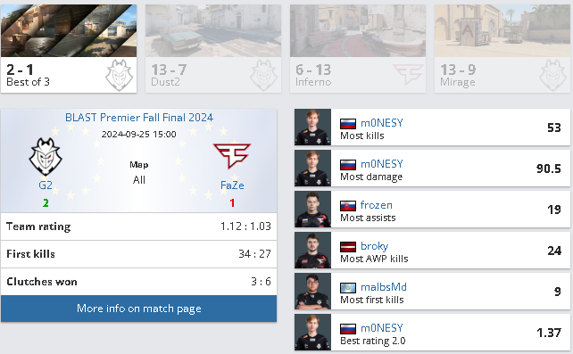 Найкращим гравцем матчу став m0NESY з G2, який набрав найбільшу кількість вбивств (53) і мав найвищий рейтинг 2.0 — 1.37. FaZe тепер перейшли в нижню сітку, тоді як G2 продовжать боротися у фіналі верхньої сітки, де вони знову зустрінуться з Natus Vincere.