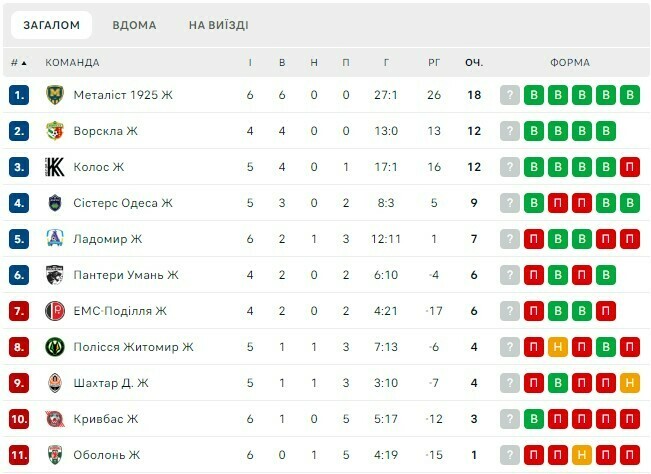 У турнірній таблиці лідирує харківський Металіст 1925, який має 18 очок з 18.