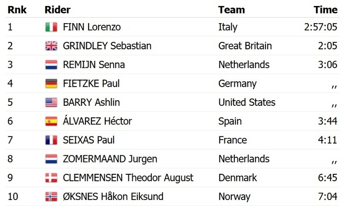Упевнену перемогу виборов італієць Лоренцо Фінн, який більш ніж на дві хвилини випередив британця Себастьяна Гріндлі. Топ-3 у спринті з групи переслідувачів замкнув нідерландець Сенна Ремейн.