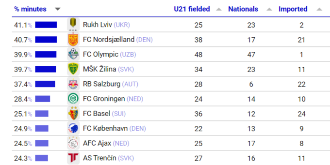 У цьому рейтингу абсолютним лідером з показником 41,1% ігрових хвилин для гравців до 21 року є львівський «Рух». Друге місце в рейтингу посів данський «Нордшелланд» (40,7%), а замикає трійку лідерів узбецький «Олімпік» (39,9).