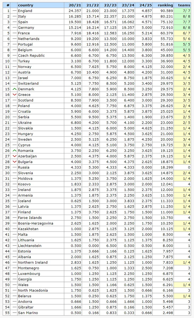 Таблиця коефіцієнтів УЄФА 2025 (впливає на розподіл путівок у сезоні 2026/27)