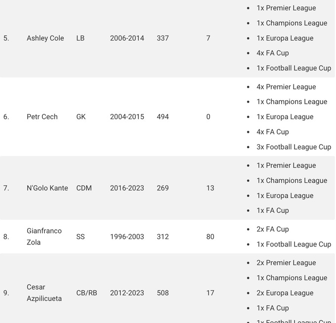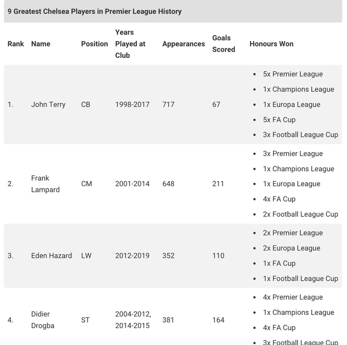 Першу позицію у рейтингу займає легендарний англійський центрбек Джон Террі. За ним розмістилися Френк Лемпард та колишній вінгер «синіх» Еден Азар.