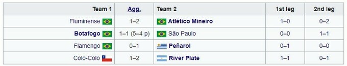 У півфіналах зіграють: Атлетіко Мінейро (Бразилія) – Рівер Плейт (Аргентина), Ботафого (Бразилія) – Пеньяроль (Уругвай).