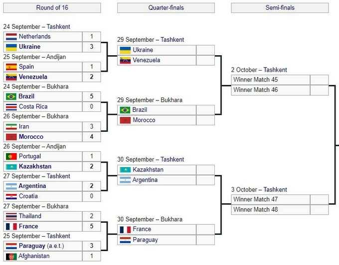 Збірна Франції у місті Бухара розгромила Таїланд 5:2. У чвертьфіналі французи зустрінуться із Парагваєм. Парагвайці на старті плей-оф впоралися з Афганістаном 3:1.