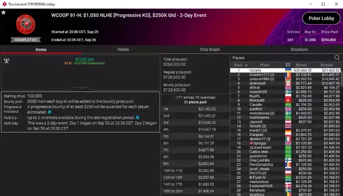 Вчора український гравець, який виступає під ніком «Voca94», оформив свою вже третю перемогу у турнірах серії WCOOP 2024. Більше перемог на цьогорічному чемпіонаті з онлайн покеру має лише канадець Паркер "Tonkaaaa" Тонка. Усі свої титули «Voca94» оформив в турнірах з безлімітного Холдему:
