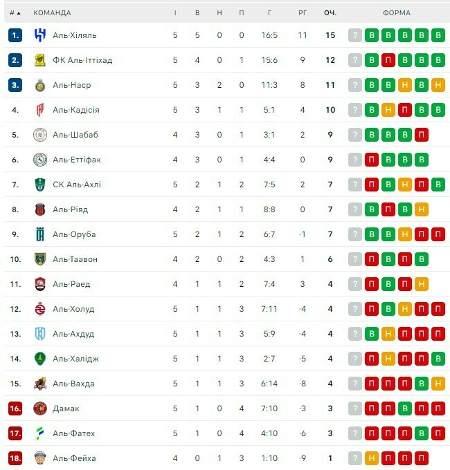 Аль-Хіляль лідирує в чемпіонаті (15 очок з 15), випереджаючи Аль-Іттіхад (12) та Аль-Наср (11).