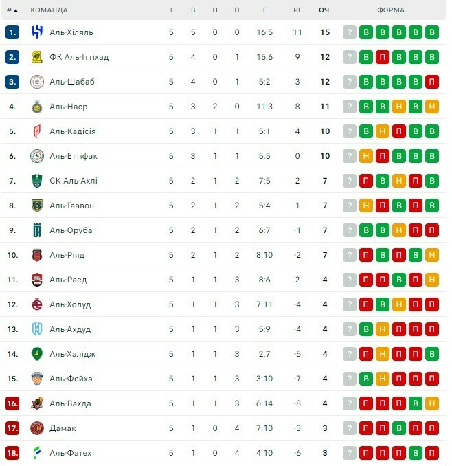 Аль-Хіляль лідирує в чемпіонаті (15 очок з 15), випереджаючи Аль-Іттіхад (12) та Аль-Наср (11).