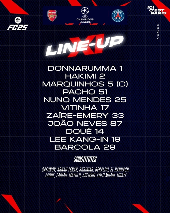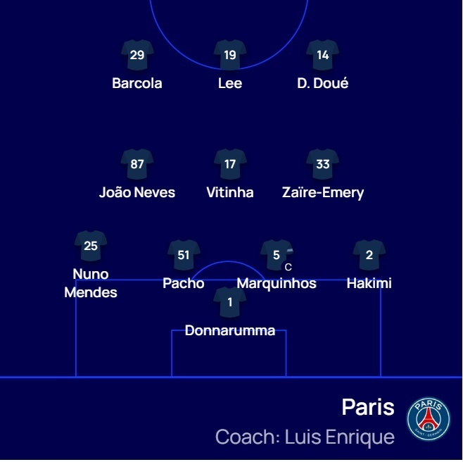 ПСЖ: Доннарумма – Мендеш, Пачо, Маркіньос, Хакімі, Жоау Невеш, Вітінья (Фабіан Руїс, 64), Заїр-Емері, Лі Кан Ін, Дуе (Коло Муані, 64), Барколя.