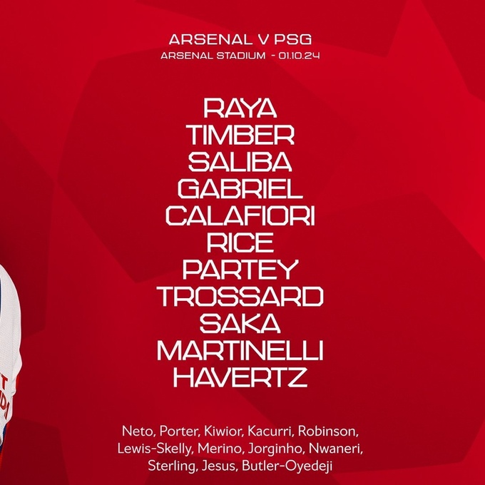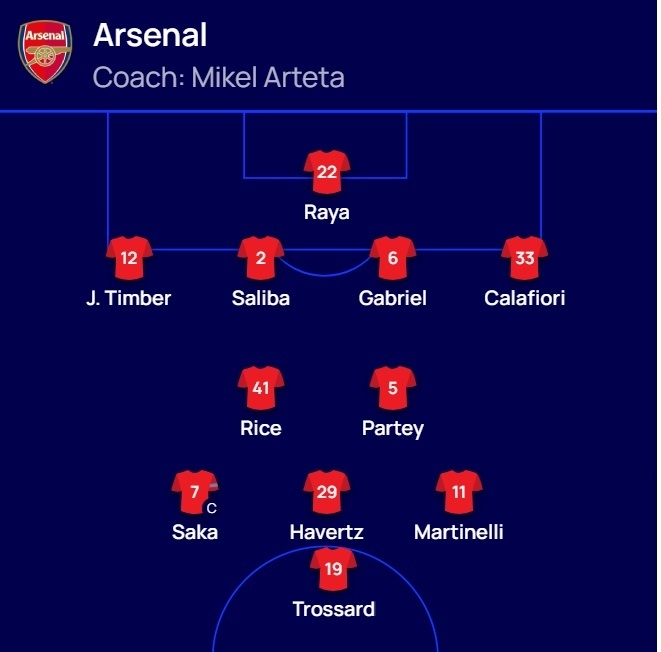 Арсенал: Рая – Калафьорі, Габріел, Саліба, Тімбер (Ківьор, 46), Райс, Парті (Меріно, 64), Мартінеллі, Сака (Льюїс-Скеллі, 90+2), Хаверц, Троссард (Габріел Жезус, 74).