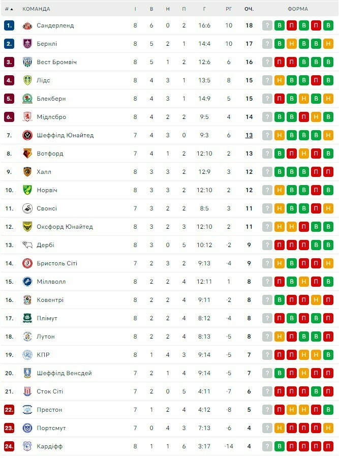 Сандерленд став лідером (18 очок), випереджаючи Бернлі (17), Вест Бромвіч (16), Лідс, Блекберн (15), Мідлсбро (14).
